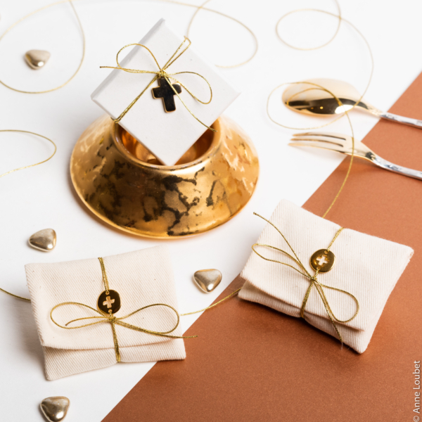 Ecrin carré habillé de papier texturé, croix dorée, attache fil or.